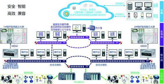 優(yōu)勢(shì):包含控制網(wǎng)、核心網(wǎng)、管理網(wǎng)以及云端四級(jí)工廠網(wǎng)絡(luò),兼容開放性好,設(shè)置軟硬件結(jié)合的縱深防御措施,安全性好,根據(jù)實(shí)時(shí)參數(shù),按照模型進(jìn)行仿真,推薦合理的運(yùn)行參數(shù),結(jié)合礦熱爐工藝參數(shù)、運(yùn)行參數(shù),計(jì)算出電極工作端實(shí)際位置