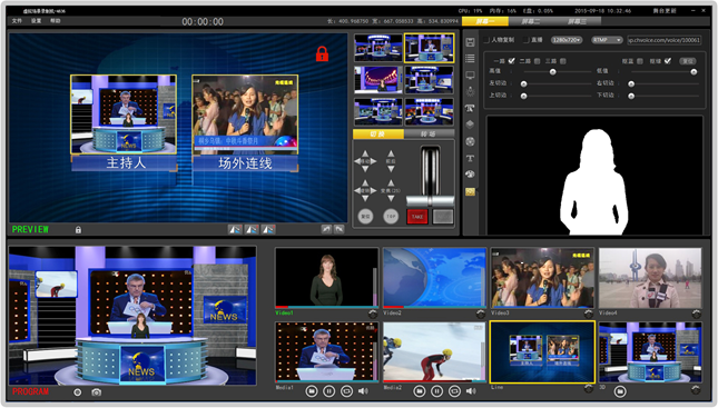 系統中集成了摳像功能、連線功能、燈光效果、倒影及鏡像功能、字幕與臺標功能、幀動畫效果制作、導播臺功能、軌道編輯功能、實時錄制與直播功能、虛擬機位設置、多個虛擬屏幕添加等全面的產品功能,實現眾多高端需求。