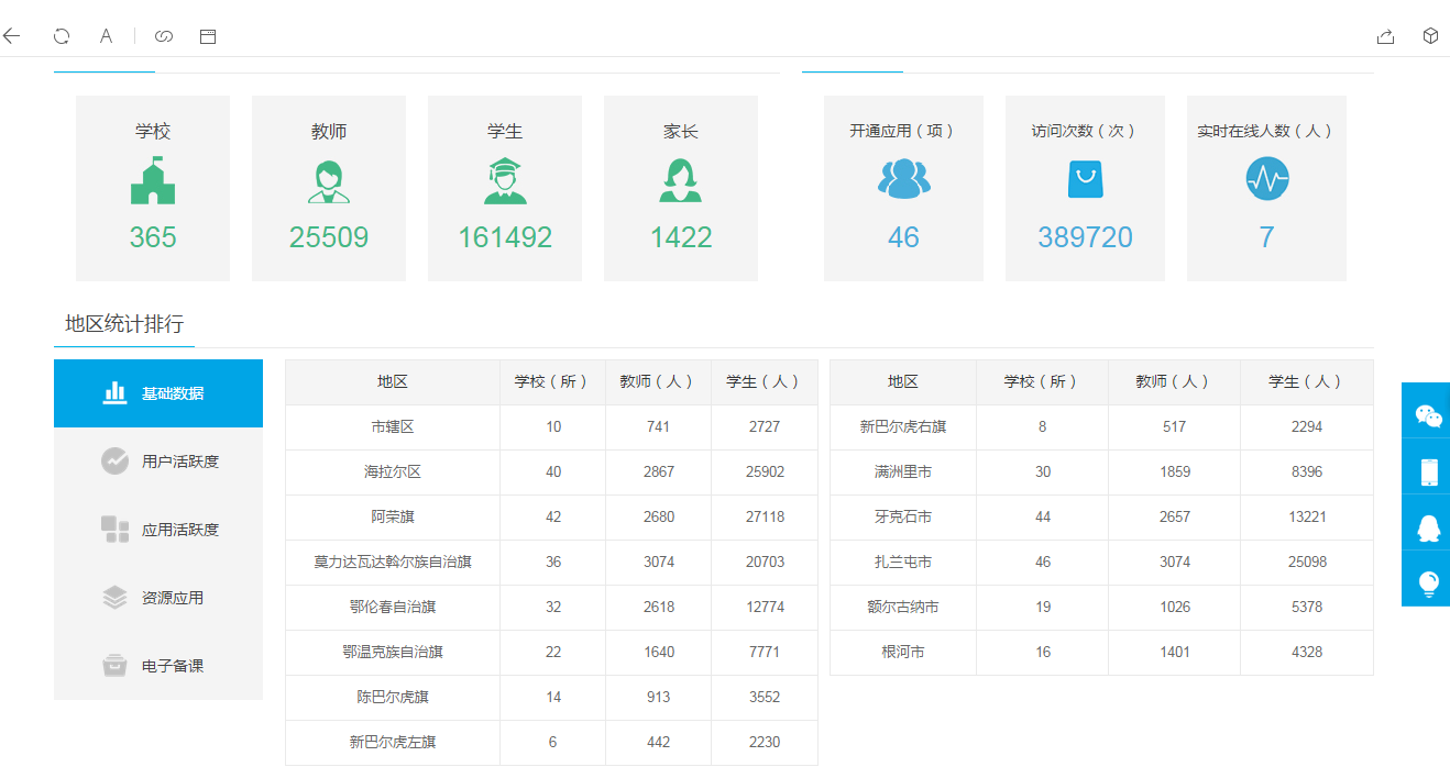 數據統計:支持學校可自定義時間段統計本校設備的使用率和老師的使用時間;支持周期統計(年月周)設備在班級的使用時長、設備告警,媒體推送的次數,資源上傳。